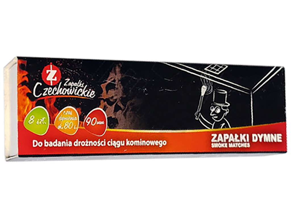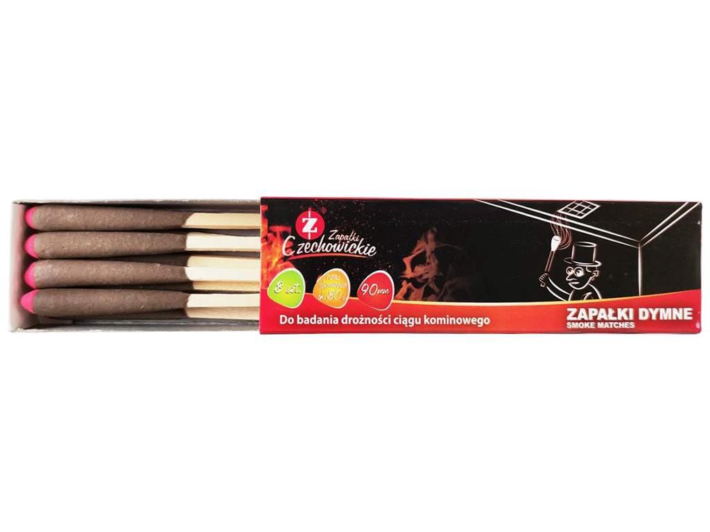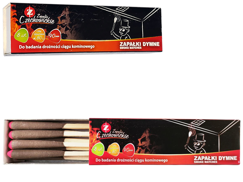 Сірники димові для перевірки тяги РСС. Довжина сірника: 90мм. Кількість штук у коробці: 8. Професійний продукт, призначений для перевірки прохідності димоходу. Час горіння сірника становить щонайменше 10 секунд. Ці сірники використовують сажотруси, фахівці з систем протипожежного захисту та пожежні. Продукт екологічний та безпечний у використанні.