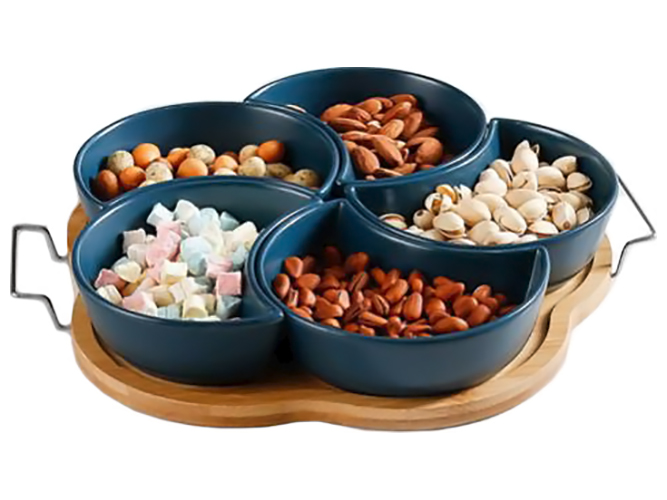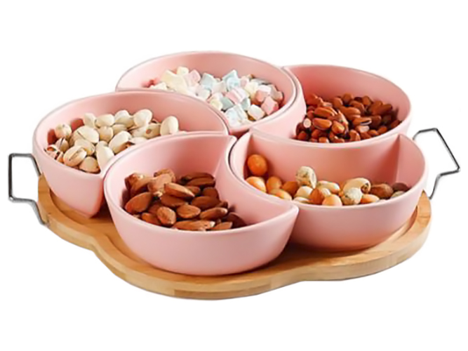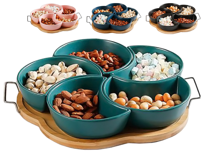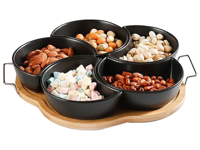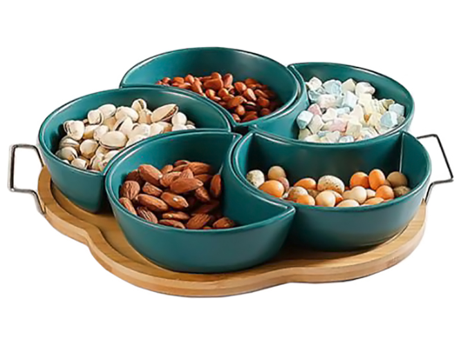Менажниці на підставці Colored. Розмір: 32,5х31см. Комплектація набору: 5 менажниць та 1 підставка. Матеріал: кераміка, метал (підставка). Забарвлення асорті. Призначені для фруктових та овочевих нарізок, м'ясних та ковбасних виробів, десертів, соусів. Чудово підійдуть для кафе, ресторанів, а також для використання вдома. Упаковка: кольорова коробка.
