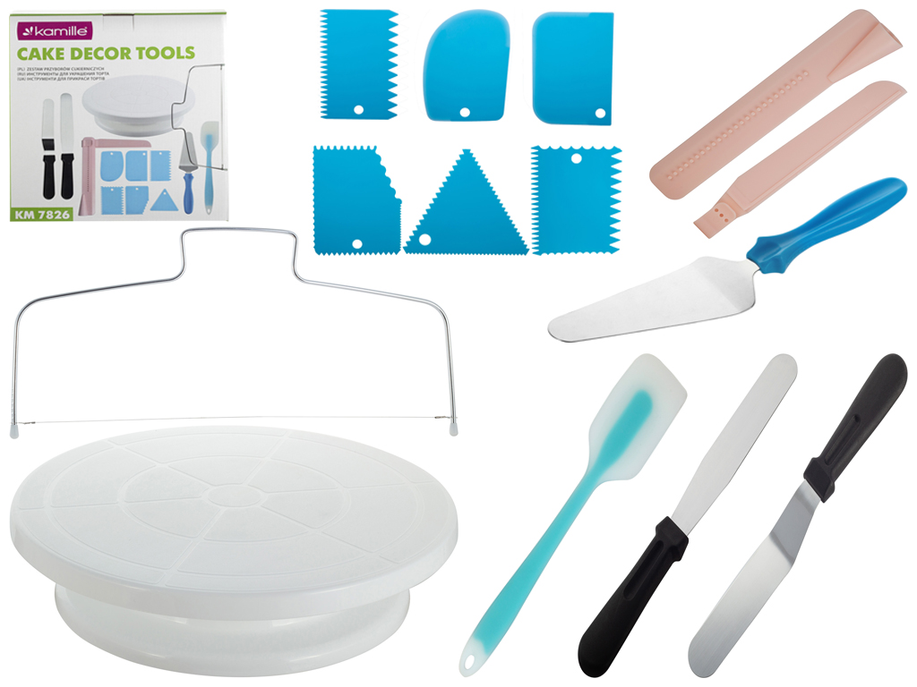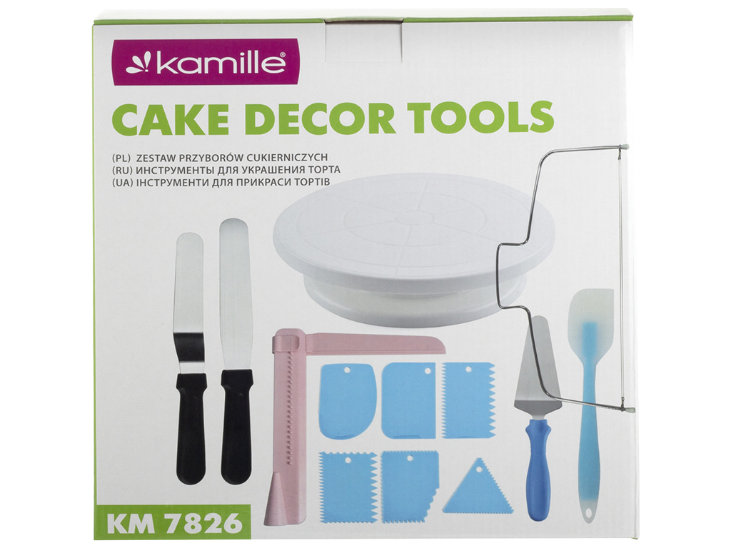 Комплектація набору: піднос для торта поворотний 27х27х7см - 1шт; кондитерський металевий шпатель з вигином для роботи з кремом, ганашем, глазур'ю 26,5см - 1шт; кондитерський металевий шпатель без вигину 26,5см - 1шт; кондитерська металева лопатка-шпатель із вигином - 1шт; силікова лопатка - 1шт; пластиковий шпатель-скребок для роботи з кремом, мастикою, марципаном, а також для створення мережива з айсингу 12х8см - 6шт; ніж-струна для нарізки бісквіту - 1шт; інструмент для вирівнювання торта (кондитерська лінійка) 24х18,3см - 1шт. У наборі використані екологічно чисті, гіпоалергенні матеріали: нержавіюча сталь, поліетилен та полікарбонат з використанням перевірених методів виробництва. Кондитерський набір Kamille - це професійний набір кондитерських інструментів для декорування тортів, кексів, печива, цукерок, пирогів та інших кондитерських виробів. Дозволить створювати незвичайний декор у домашніх умовах легко та просто. Набір для кондитера складається з 13 предметів і включає все необхідне для створення Вами шедеврів. Упаковка: кольорова картонна коробка.