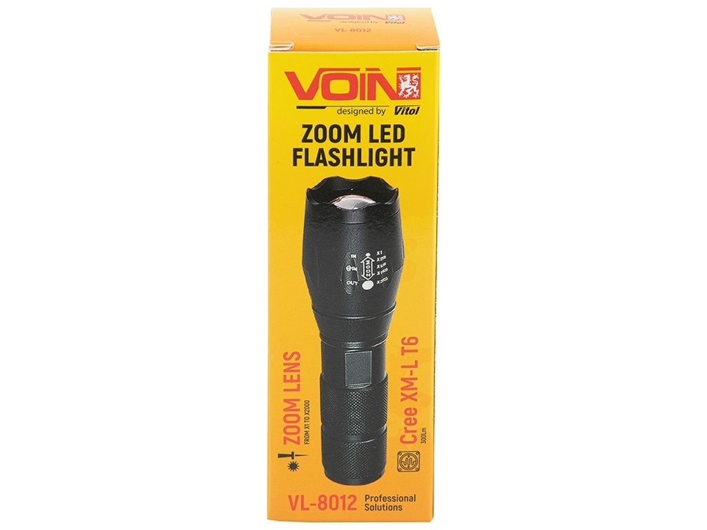 Ліхтарик ручний VOIN VL-8012, LED T6 має зручну кнопку вимкнення та кліпсу для ременю. Захист від бризок води. Зум і 5 режимів роботи. Матерал: аллюміній. Тип світлодіода: Т6. Розмір: 4х13,8см, вага: 266г. Яскравість: 300 люменів.