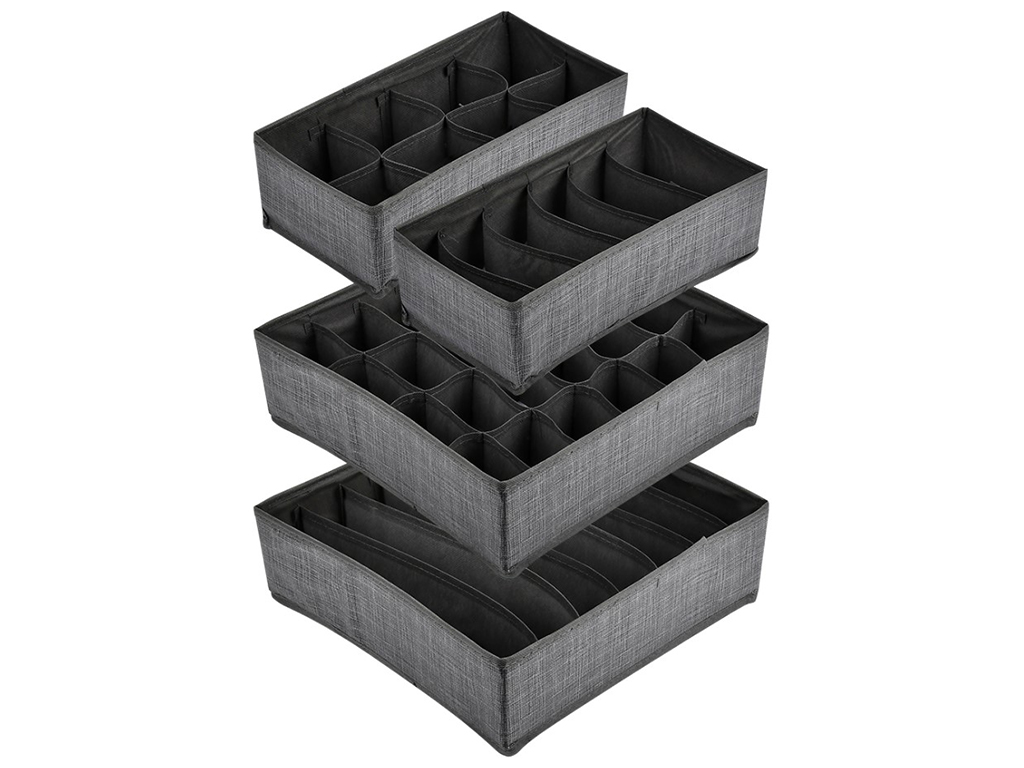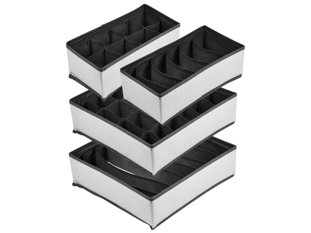 Набір містить 4 коробки-органайзера: на 7 відділень 33х31х10см, на 24 відділення 33х30х10см, на 6 відділень 33х15х10см, на 8 відділень 28х14х10см. Матеріал: картон, неткане полотно (ПВХ). Органайзер підійде для зберігання нижньої білизни, шкарпеток та інших дрібних речей. У складеному вигляді займає мало місця. Він легко складається. Просто розстебніть блискавку на дні і стисніть стінки долонями. Поставляється в пакеті.
