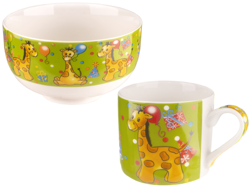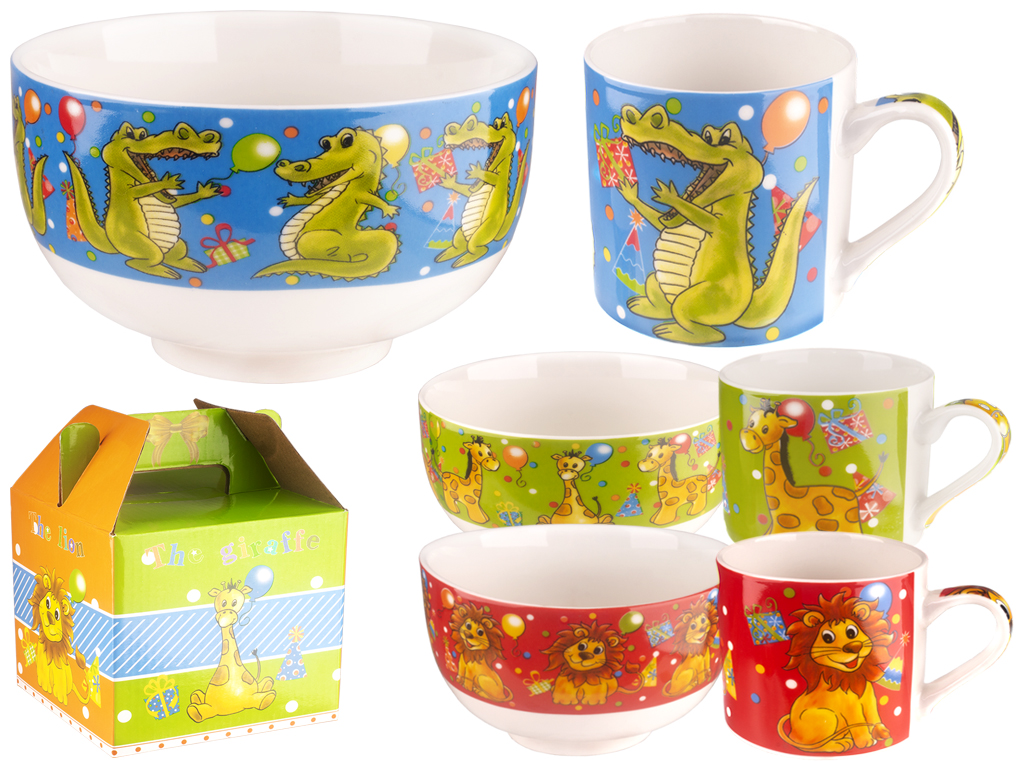 Розмір: чашка 11,9х8,5х8см, супниця 11,9х11,9х7,7см. Об'єм: чашка 300мл, супниця 500мл. Посуд прикрашений барвистим малюнком. Забарвлення асорті: жираф, крокодил, лев. У подарунковій коробці.