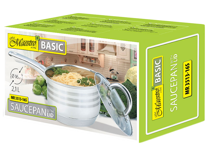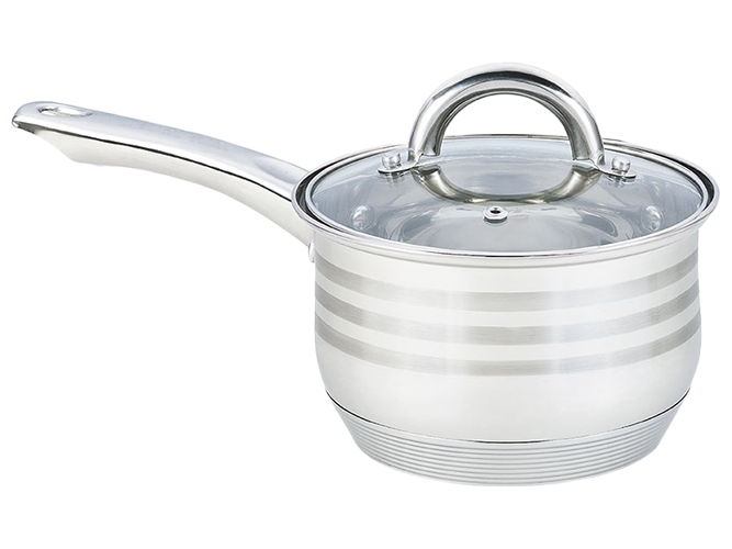 Ківш з кришкою. Розмір: діаметр 16см; висота 10,5см. Об'єм: 2,1л. 9-ти шарове термоакумулююче дно. Підходить для всіх типів плит. Високоякісна нержавіюча сталь.