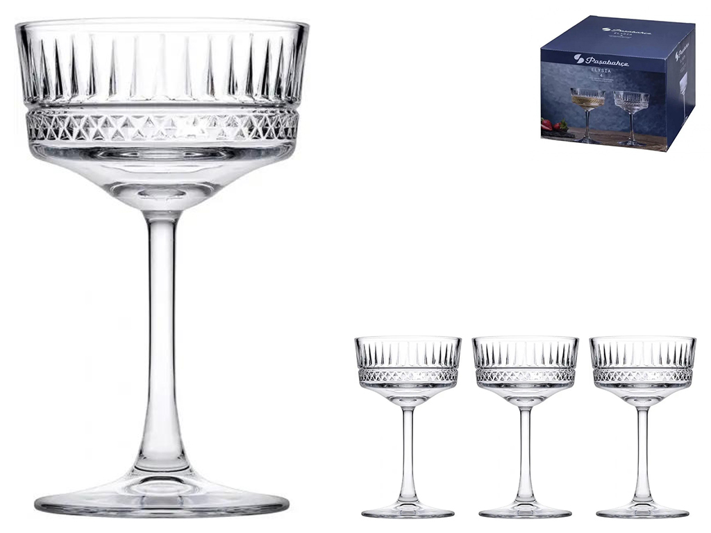 Призначені для подачі шампанського та інших ігристих напоїв. Виготовлені з міцного скла з рельєфним візерунком, який надає келихам елегантного та стильного вигляду. Висока ніжка та стійка форма роблять ці келихи ідеальними для використання у кафе, ресторанах чи вдома. Підходять для щоденного використання.