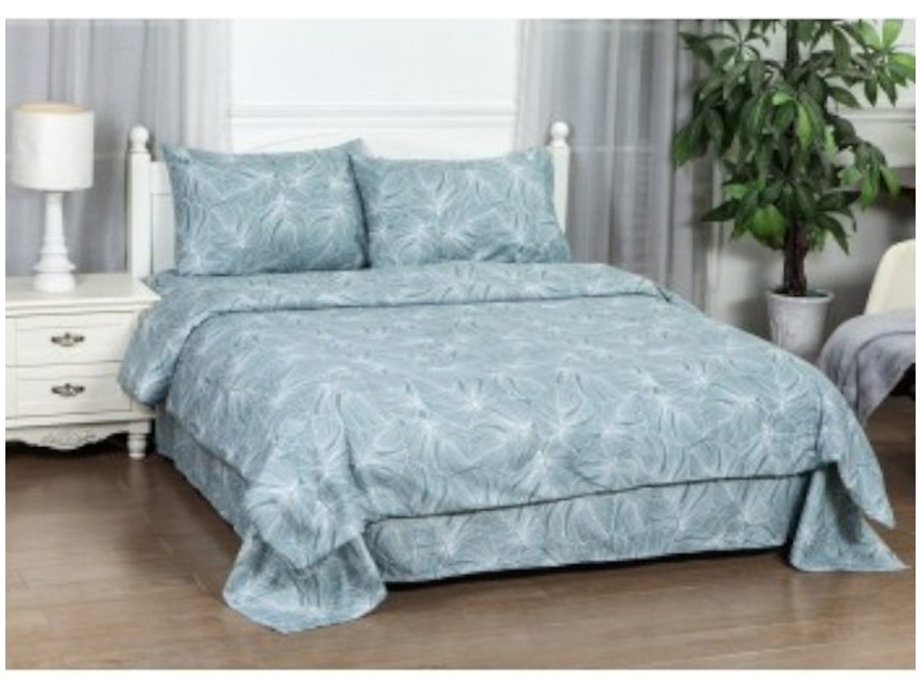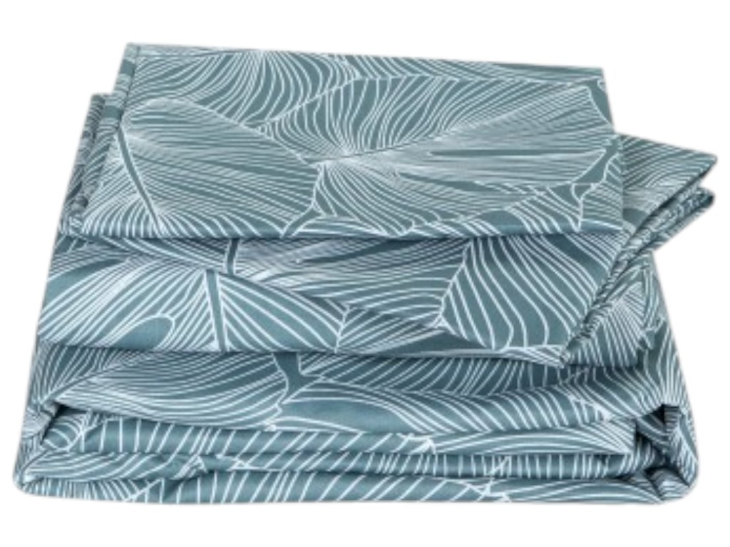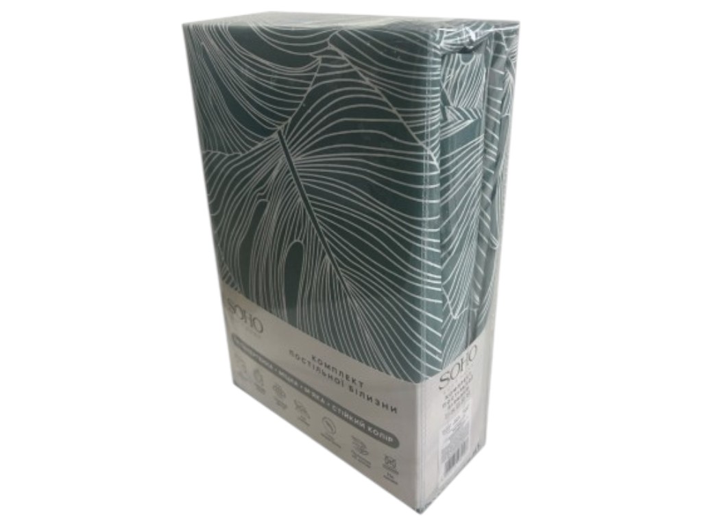 Склад включає підковдру 150×200 см, простирадло 155×220 см та дві наволочки 50×70 см, узгоджені за розмірами для полуторного ліжка. Полотно з 100% поліестеру має гладку поверхню та рівномірну структуру, зберігає форму у звичайних циклах догляду за умови дотримання маркування на ярличку. Комплект SOHO Flora Green подають як готове рішення для щоденного застилання: елементи сідають без підгонки, кути фіксуються по периметру, простирадло перекриває площу матраца. Перед першим використанням виконують окреме прання. У подальшому наволочки та підковдру вивертають, застосовують нейтральні рідкі засоби без відбілювачів, сушіння проводять у провітрюваному місці, складання виконують лише після повного висихання. Під час застилання послідовність стандартна: спочатку надягають підковдру і вирівнюють кути, далі розстеляють простирадло та одягають наволочки. Зберігання здійснюють у сухих умовах, у закритій шафі з доступом повітря. Візуальна тема Flora Green узгоджується з однотонними покривалами і пледами, що спрощує комбінування з наявним текстилем спальні.