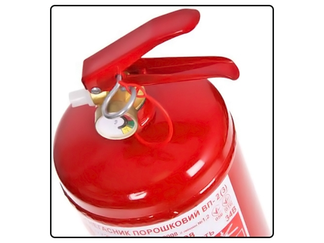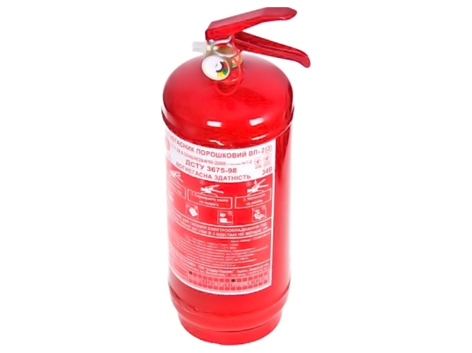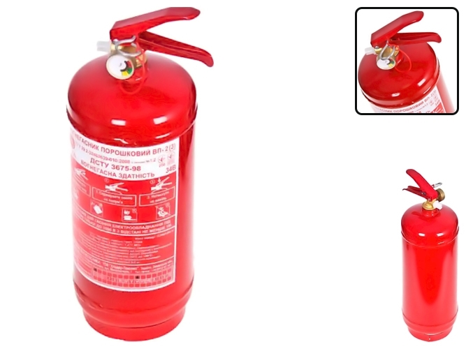 Вогнегасник порошковий з манометром. Вогнегасник порошковий переносний. Приводиться в дію запірно-пусковим пристроєм типу важеля. Можливе перезаряджання. Маса заряду: 2кг.