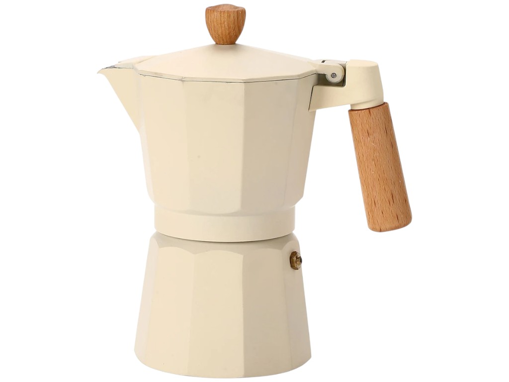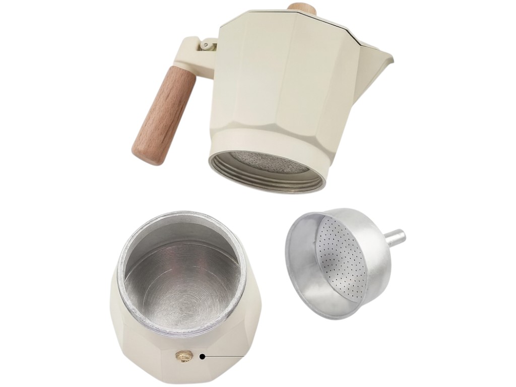 Гейзерна кавоварка розрахована на шість порцій ароматної кави й підходить для домашнього та похідного використання. Класична конструкція з харчового алюмінію рівномірно розподіляє тепло, створюючи насичений смак напою з густою пінкою. Корпус міцний і стійкий до нагрівання, водночас зберігає легку вагу та зручність в експлуатації. Дерев’яна ручка й верхня кнопка кришки не нагріваються та комфортно лежать у руці, забезпечуючи безпеку під час наливання. Кавоварка має металеве сито й клапан, що регулює тиск під час варіння. Процес приготування традиційний: у нижній відсік наливається вода, у фільтр засипається мелена кава, потім пристрій ставлять на плиту, і через кілька хвилин напій піднімається у верхній резервуар. Модель сумісна з газовими, електричними та індукційними плитами за використання розсікача, а також підходить для кемпінгу. Виріб застосовується для приготування еспресо, капучино, латте й американо. Для очищення достатньо промити частини під проточною водою та просушити, не використовуючи мийні засоби. Поверхня стійка до подряпин і не тьмяніє з часом. Кавоварка представлена у двох кольорах — кремовому та чорному, поєднується з дерев’яними елементами й пасує до будь-якого стилю кухні.