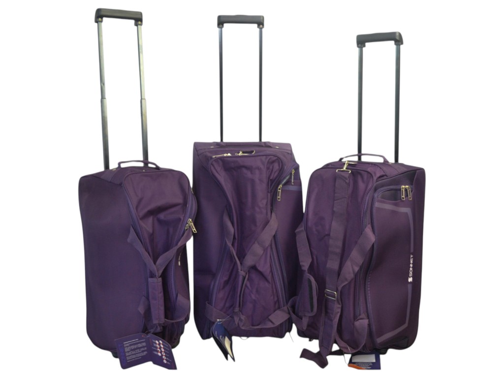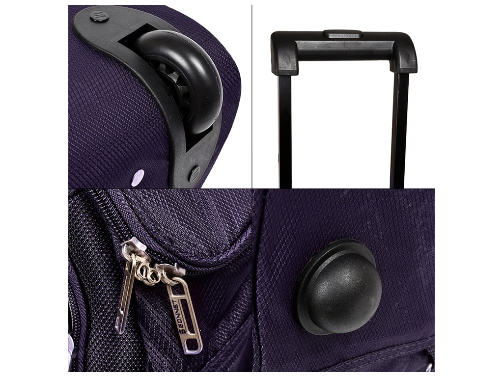 Комплект із трьох дорожніх сумок різного розміру. Кожна сумка оснащена двома колесами, телескопічною висувною ручкою, двома ручками для перенесення та знімним плечовим ременем. У комплекті: