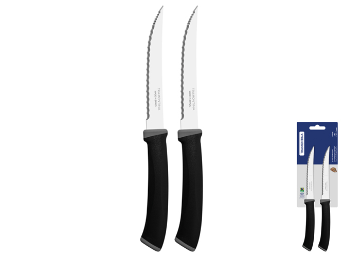 Набір ножів Tramontina Felice Black, для стейка, зубчатий, 12,7см ідеальні компаньйони у ваших щоденних кухонних справах. Високоякісна нержавіюча сталь леза, надійні та ергономічні поліпропіленові ручки, що витримують високі температури ці властивості забезпечують довговічність використання, поєднану з винятковою силою розрізання харчових продуктів. Кількість в наборі: 2шт.