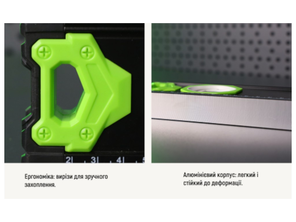 Забезпечує точні вимірювання горизонтальних, вертикальних і кутових площин завдяки трьом вбудованим капсулам на 0°, 45° і 90°. будівельних, монтажних та ремонтних об'єктах.