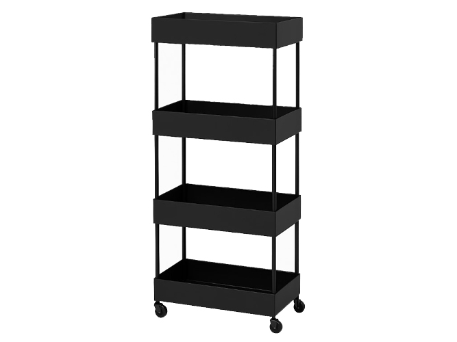 Компактна етажерка на колесах із чотирма ярусами — зручне рішення для зберігання дрібниць на кухні, у ванній або робочому кабінеті. Каркас виконаний із міцного фарбованого пластику чорного кольору, що надає конструкції сучасного вигляду та витримує щоденне навантаження. Кожна полиця оснащена високими бортиками, які запобігають випаданню предметів під час переміщення. Завдяки коліщаткам етажерку легко пересувати навіть у вузьких просторах. Її мінімалістичний дизайн гармонійно доповнить будь-який інтер'єр. Ідеально підходить для зберігання спецій, косметики, канцтоварів або кухонного приладдя.
