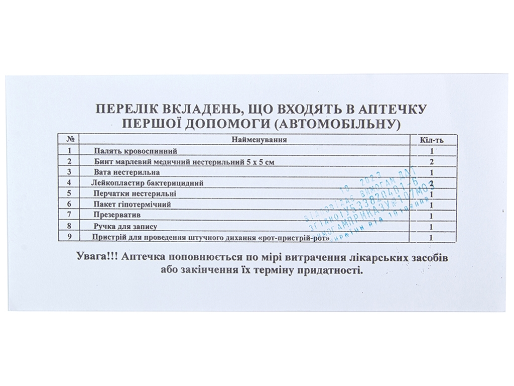 Аптечка медична – це набір виробів медичного призначення, необхідний для комплектування легкових автомобілів. Оснащена засобами для надання першої медичної допомоги потерпілому.