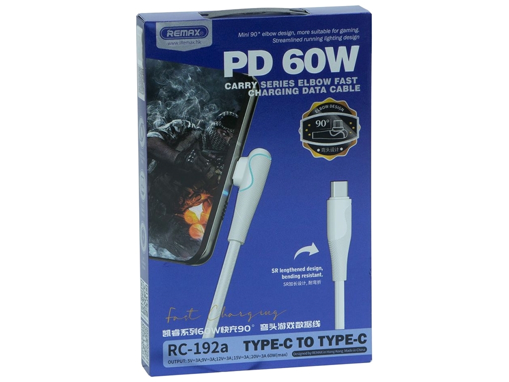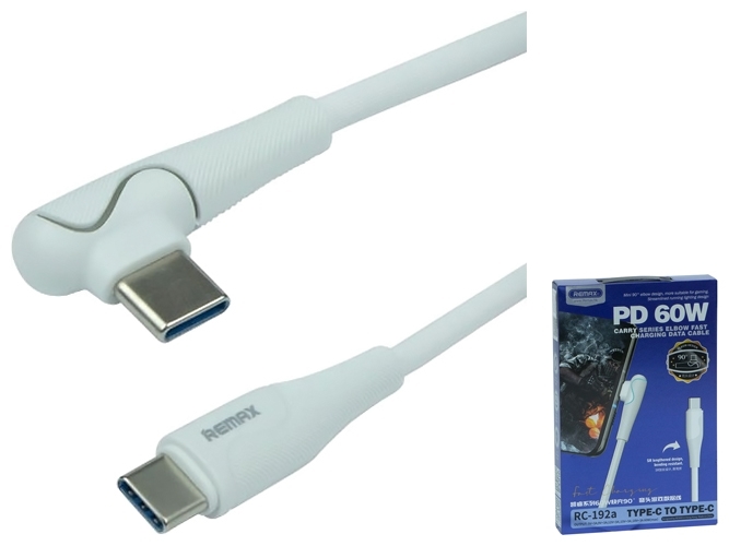 ?Кабель USB Remax RC-192a 60W 90° - сучасний кабель, що відрізняється практичною реалізацією та універсальністю, що дозволяє використовувати його для заряджання смартфонів, планшетів і навіть ноутбуків, підключення гаджетів до комп'ютера для синхронізації. Оригінальна реалізація конектора, призначеного для підключення до роз'єму для зарядки пристрою, забезпечить максимальний комфорт у повсякденній експлуатації завдяки своїй Г-подібній формі та стильно виконаному LED індикатору. Таке рішення дозволить із зручністю, наприклад, грати в гру на смартфоні під час його зарядки, не заламуючи кабель, визначити чи подається на нього харчування і буде дуже корисним в умовах недостатнього освітлення. Корпуси роз'ємів та обплетення кабелю мають приємну на дотик рельєфну поверхню, виготовлені з міцних еластомерів, стійких до зламів, розтягувань, високих та низьких температур. Модель оснащена інтелектуальною мікросхемою, що контролює процес зарядки, має потовщені жили із чистої міді, що дозволяє кабелю витримувати потужність 60Вт. Встановлення з'єднання між пристроями здійснюється через Type-C – Type-C.