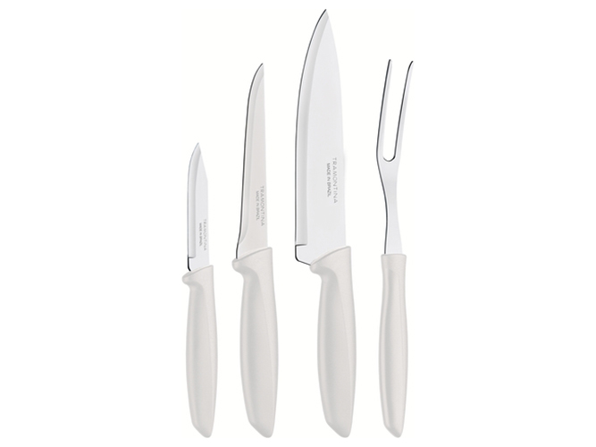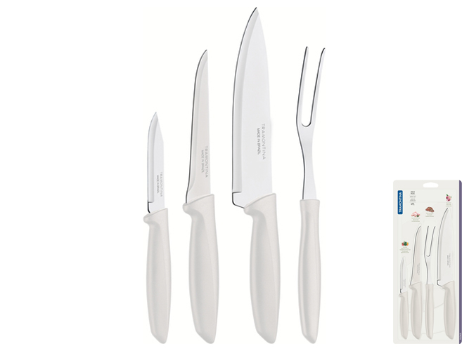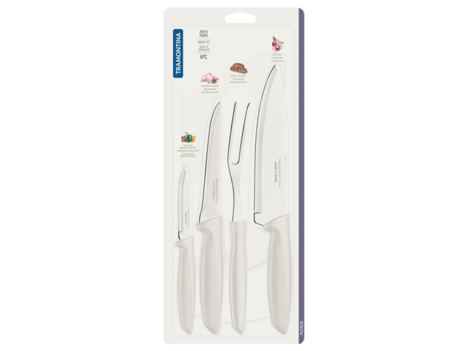 Набір ножів Tramontina Plenus light grey, 4 предмети. Комплектація: ніж кухарський Шеф 1шт-17,8см, ніж обвалочний 1шт-12,7см, ніж для овочів 1шт-7,6см, вилка для м'яса 1шт. Матеріал леза: нержавіюча сталь AISI 420. Матеріал ручки: поліпропілен. Ріжуча кромка ножа: гладка зубчаста. Упаковка: індивідуальний блістер.