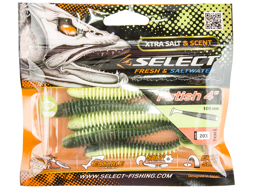 Бренд: Select. Тип приманки: віброхвіст. Довжина: 100мм. Товщина тіла: 12мм. Кількість в упаковці: 5шт. Силікон Select Fetish - дуже вдала копія легендарного силікону Keitech Swing Impact. Приманка призначена для лову окуня, щуки, і судака. Силікон Select - це їстівна приманка, до складу матеріалу входить сіль і атрактант. Приманка володіє власним запахом, який привертає пасивного хижака. Склад силікону досить міцний не рветься добре тримається на гачку і не сповзає.