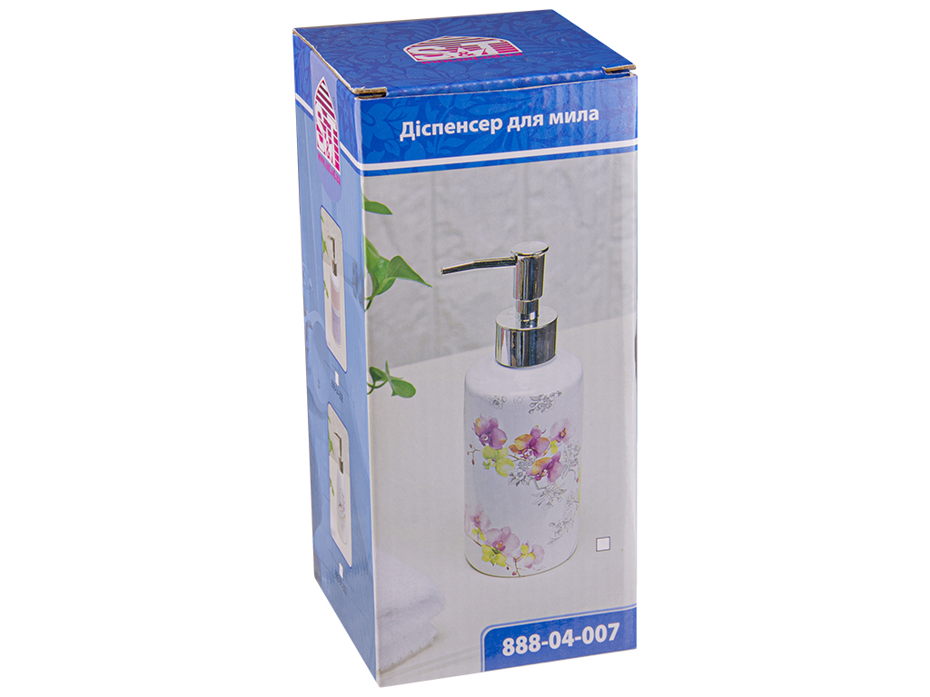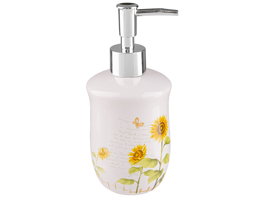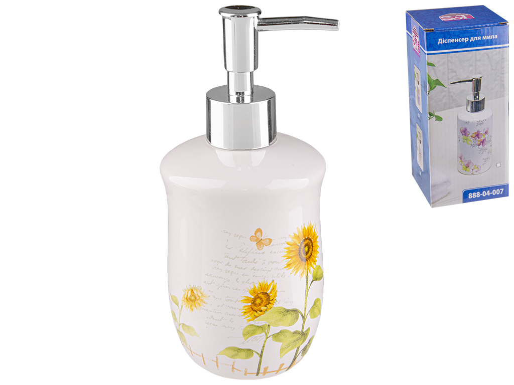 Диспенсер для мыла "Подсолнух" с пластиковым хромированным дозатором. Объем: 350мл. Размер: 7,8х7,8х17,5см. Аксессуар в ванную комнату. Материал: эмалированная керамика.