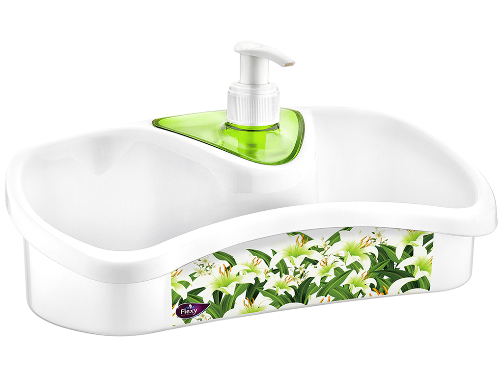 Подставка для моющих средств. Размер: 26х9х14см. Упаковка: 27х10х12см. Цвет: белый. Отлично подойдет для хранения губок для мытья посуды, мыла, моющих средств. Имеется отсек для моющей жидкости с дозатором.