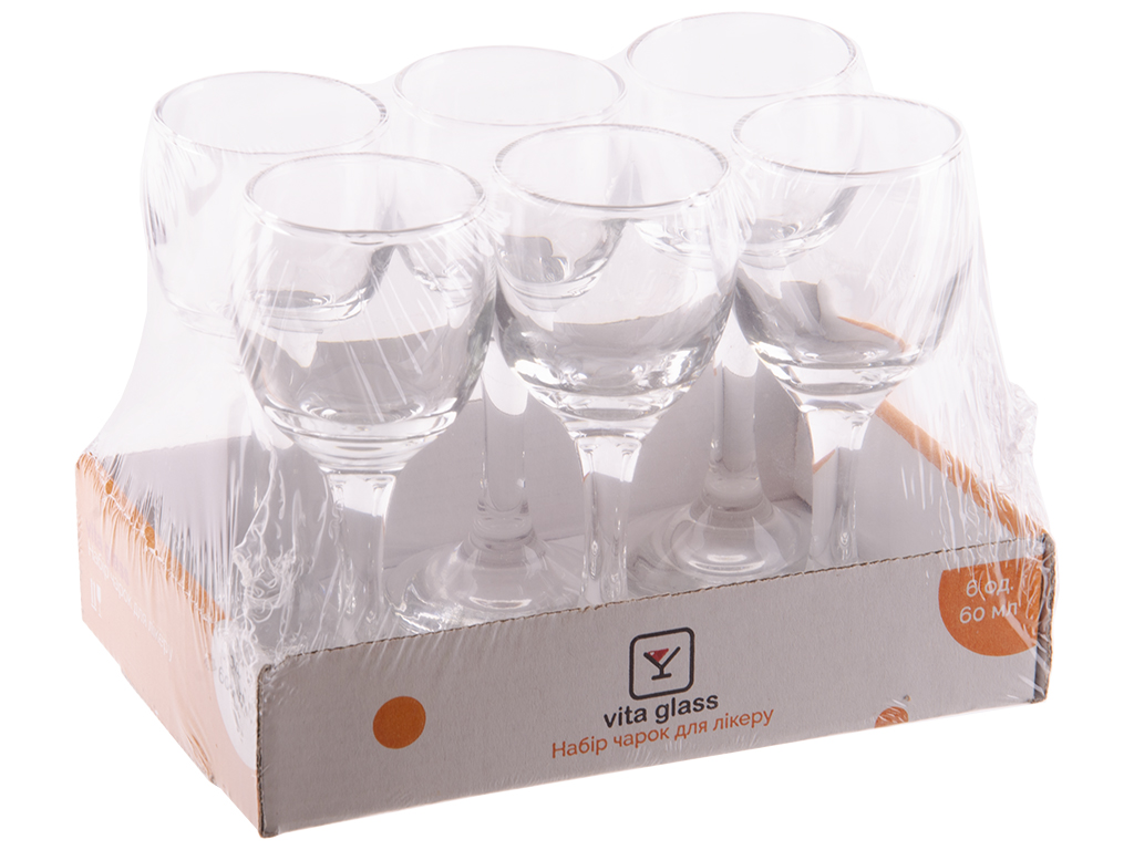 Набор рюмок Vita Glass Kouros. Размер: 4,5х4,5х11,3см. Объем: 60мл. Количество штук в наборе: 6. Назначение: для ликера. Упаковка: картонная коробка, пленка 16,4х10,3х11,7см.