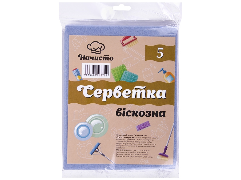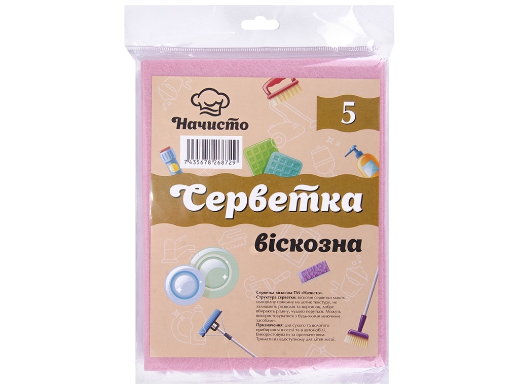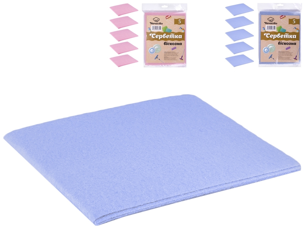 Количество в упаковке: 5шт. Размер салфетки: 30Х39см. Упаковка: пакет 17х1,8х25см. Цвета ассорти: розовый, голубой. Вискозные салфетки имеют однородную приятную на ощупь текстуру, не оставляют разводов и ворсинок, прекрасно стираются. Могут использоваться с любыми моющими средствами. Назначение: для сухой и влажной уборки в помещении и в автомобиле.
